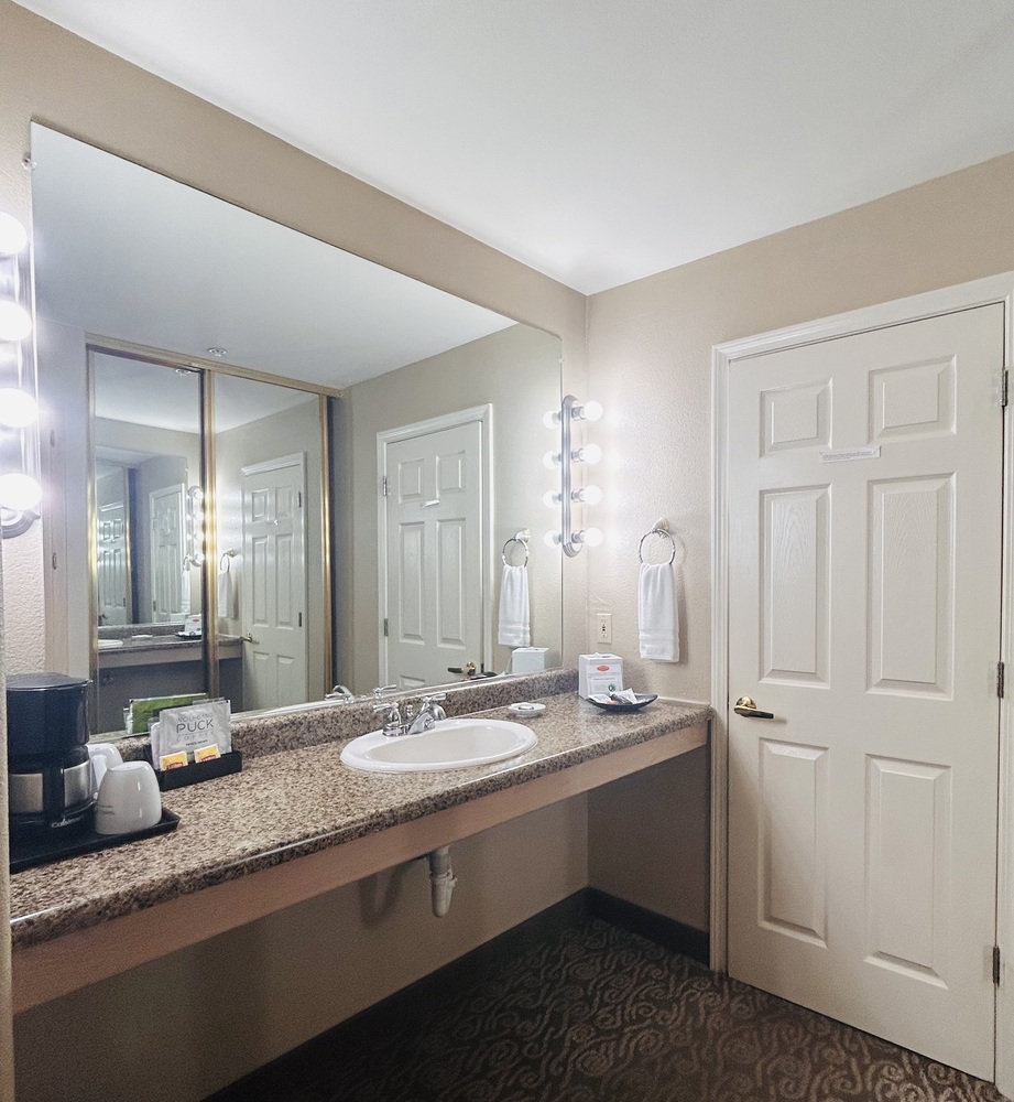 Roll-in Shower with seat, Grab bars, Handheld shower head, Accessible sink and Toilet, Accessible Writing Desk, 3 in 1 Strobe, Smoke & Carbon Monoxide Alarm, Wheelchair Lap Tray, Hair dryer, Coffee Maker/Microwave/Refrigerator & In Room Coffee/Tea