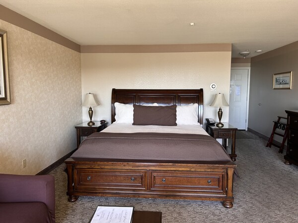 Our King Suites feature a luxurious California King bed, breathtaking ocean views, a cozy gas fireplace, a comfortable seating area, and a private oceanfront balcony.